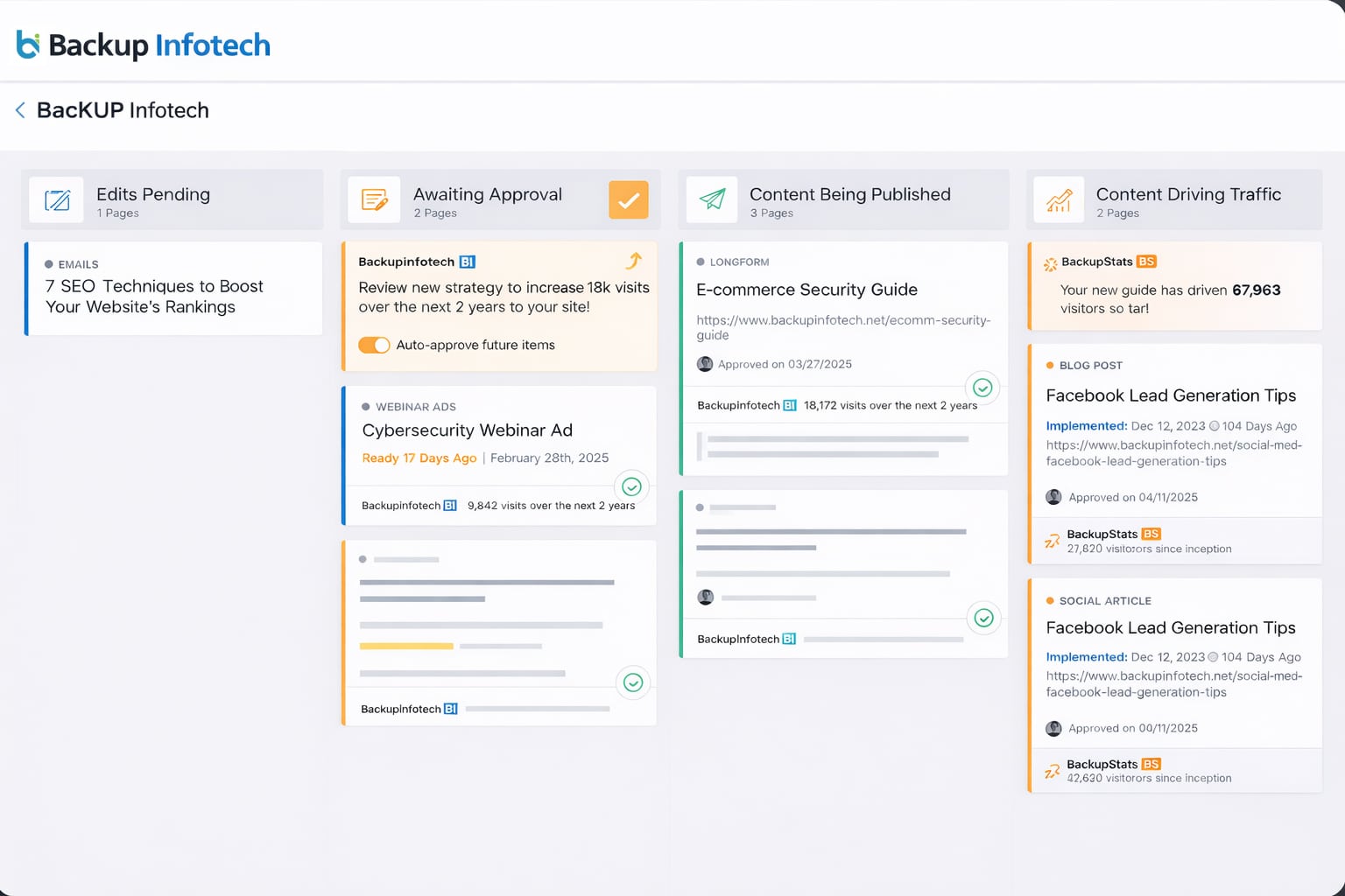 Backup Infotech helps you create better content in less time. We also track revenue influence and adapt content delivery through personalization. No need for speculation. Just clear and actionable insight into what works and why.